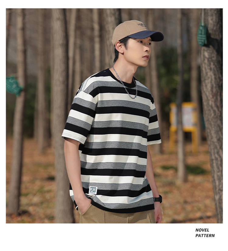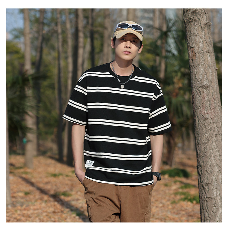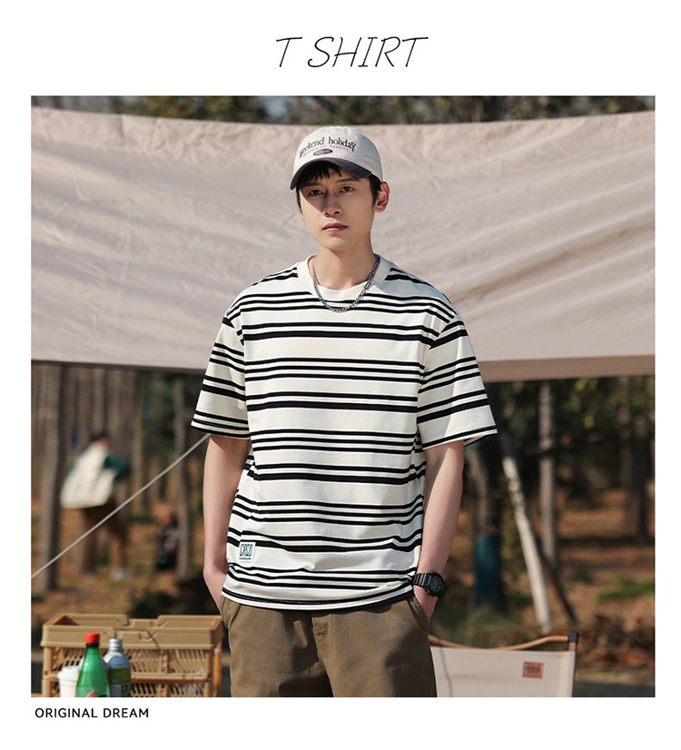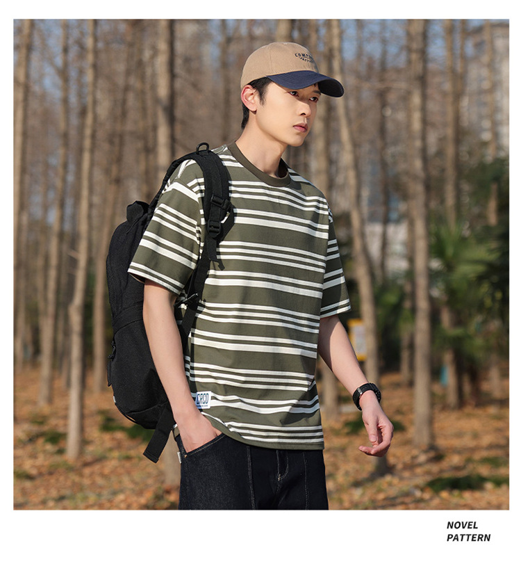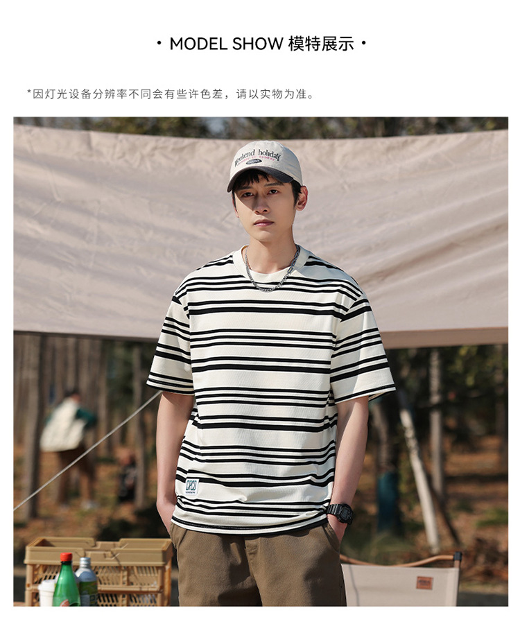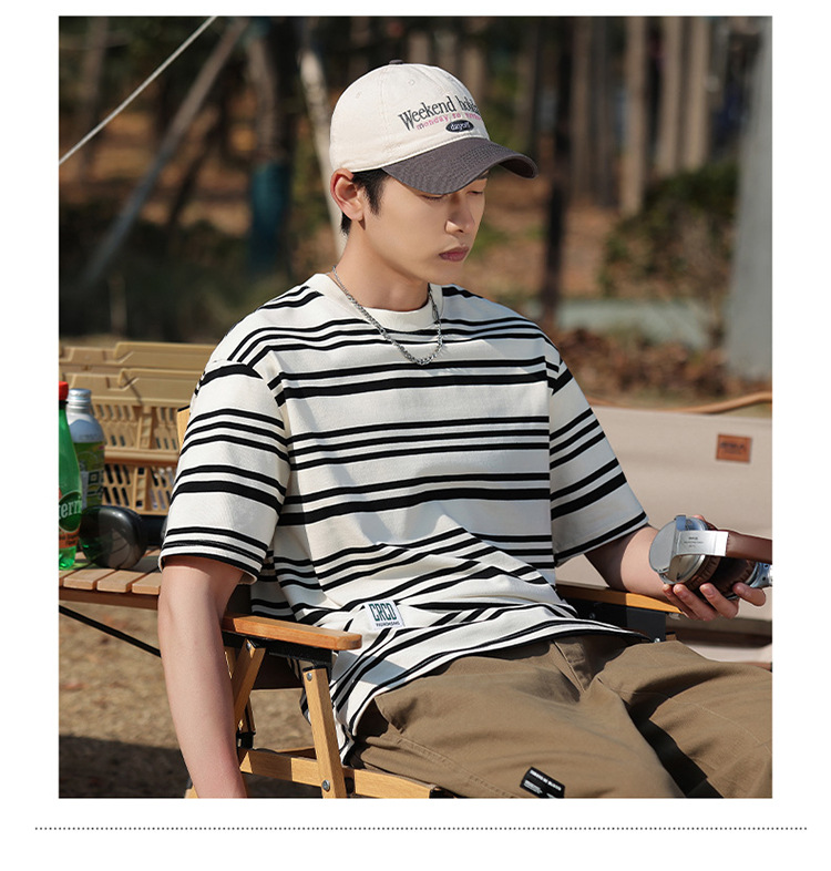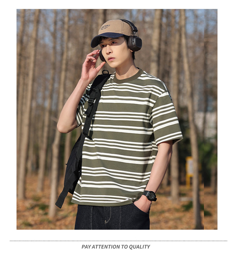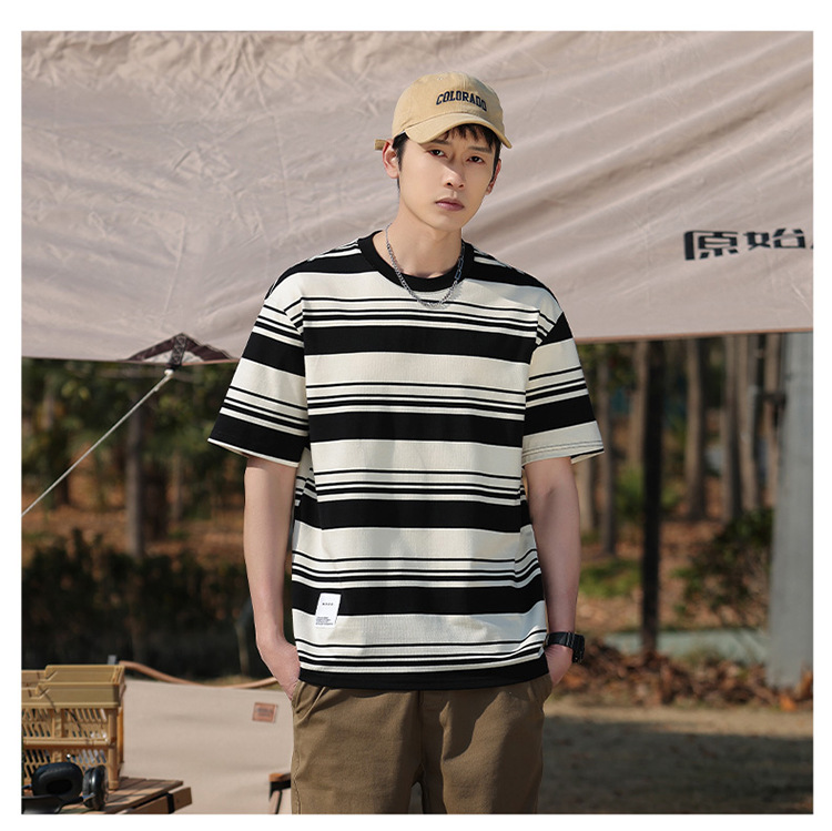 美式潮牌条纹插肩袖短袖男夏季新款230g重磅圆领宽松休闲T恤上衣