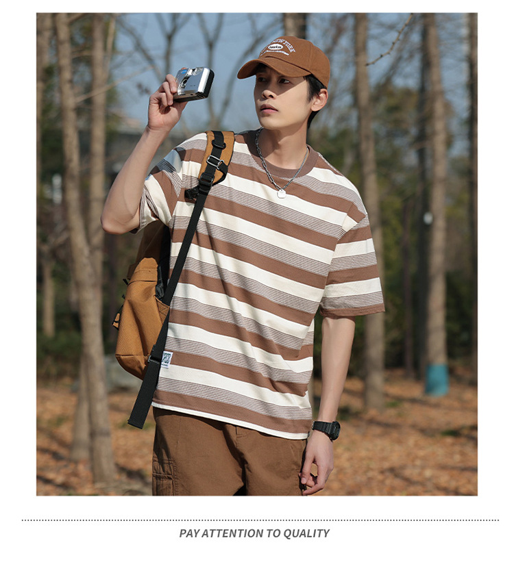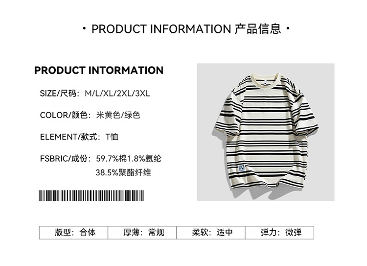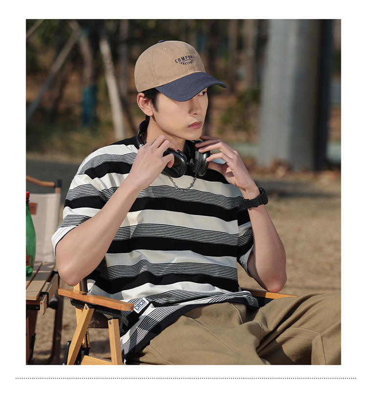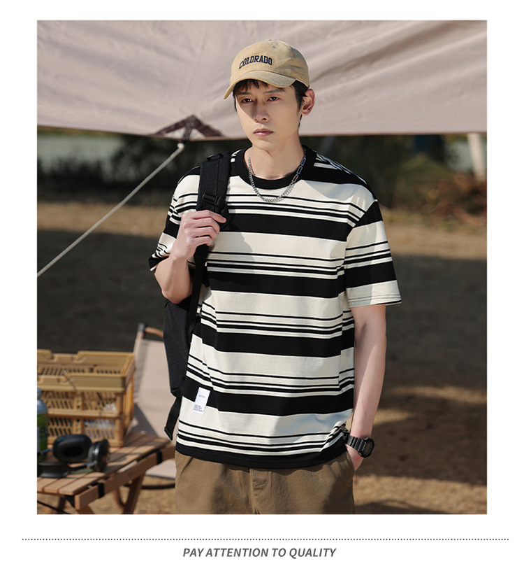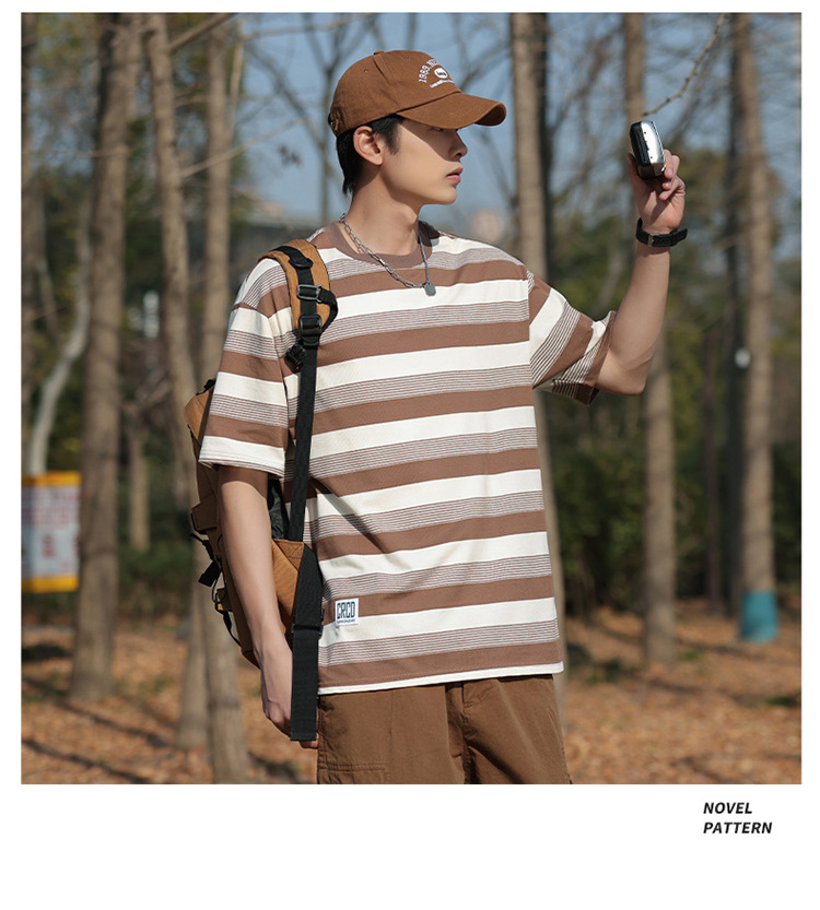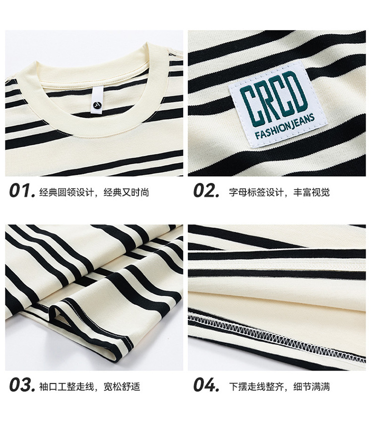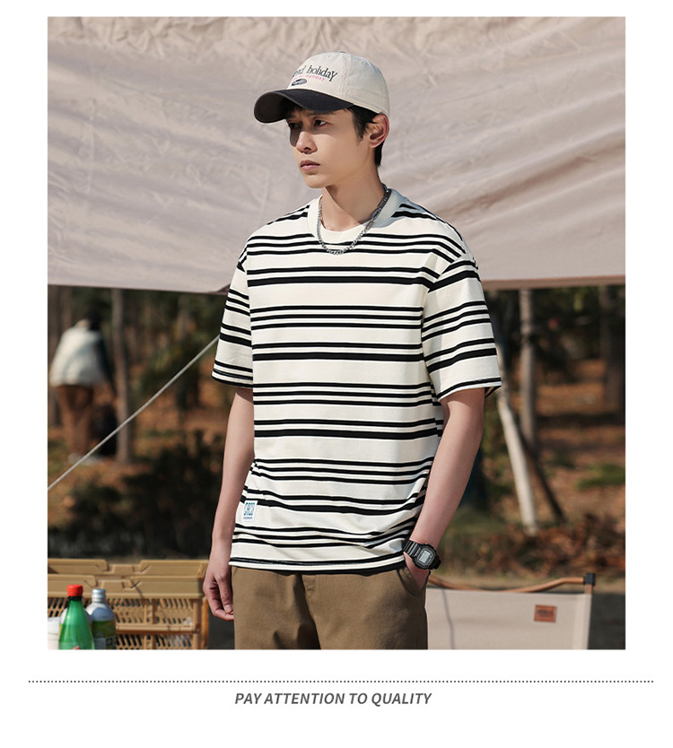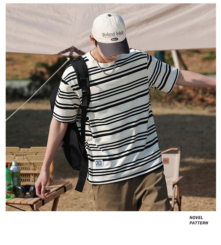 美式潮牌条纹插肩袖短袖男夏季新款230g重磅圆领宽松休闲T恤上衣